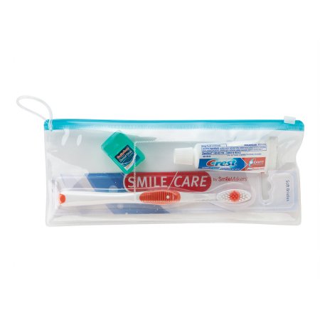 - Each SmileCare adult oral care kit includes a SmileCare adult Proper Care toothbrush, .85 oz Crest toothpaste, and waxed mint floss in a convenient 3 3/4 x 9-3/4 inch clear vinyl zipper pouch with a pocket for your business card or appointment reminder